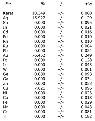 In this report from an 18K necklace, we see the gold content is measured at 76.452% Au. The precision value (±0.249) means that if you were to test this same spot again, 95% of the time the result would fall between ~76.203% and 76.701% Au. This shows the reading is very consistent. Remember we're looking for less than or equal to .5 in this column.